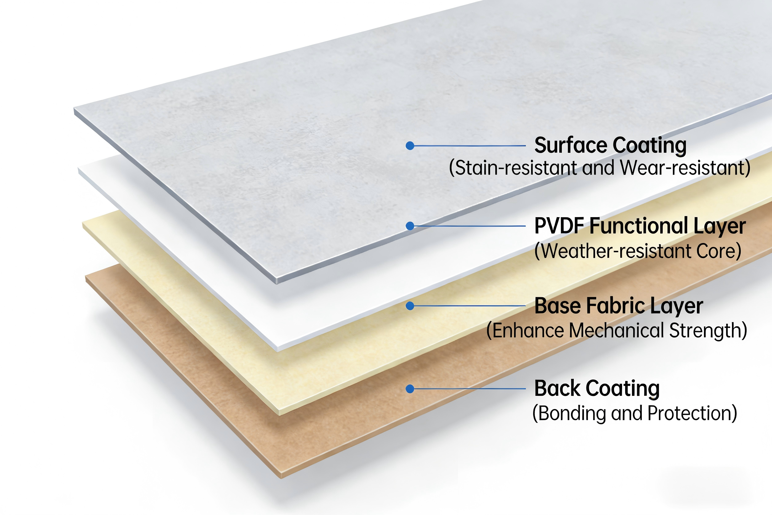 - PVDF Functional Layer – The core layer that provides excellent weather resistance, including UV and corrosion protection.